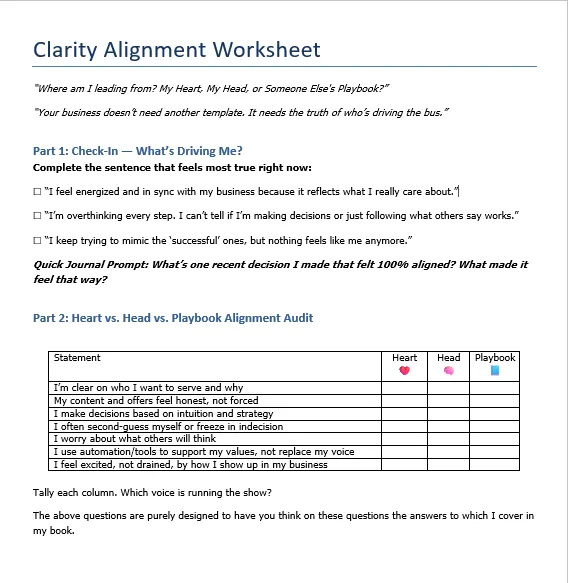 Worksheet or Journal Prompt Page:Simple “clarity alignment” worksheet: “Where am I leading from? My Heart, My head, or Someone Else's Playbook?”